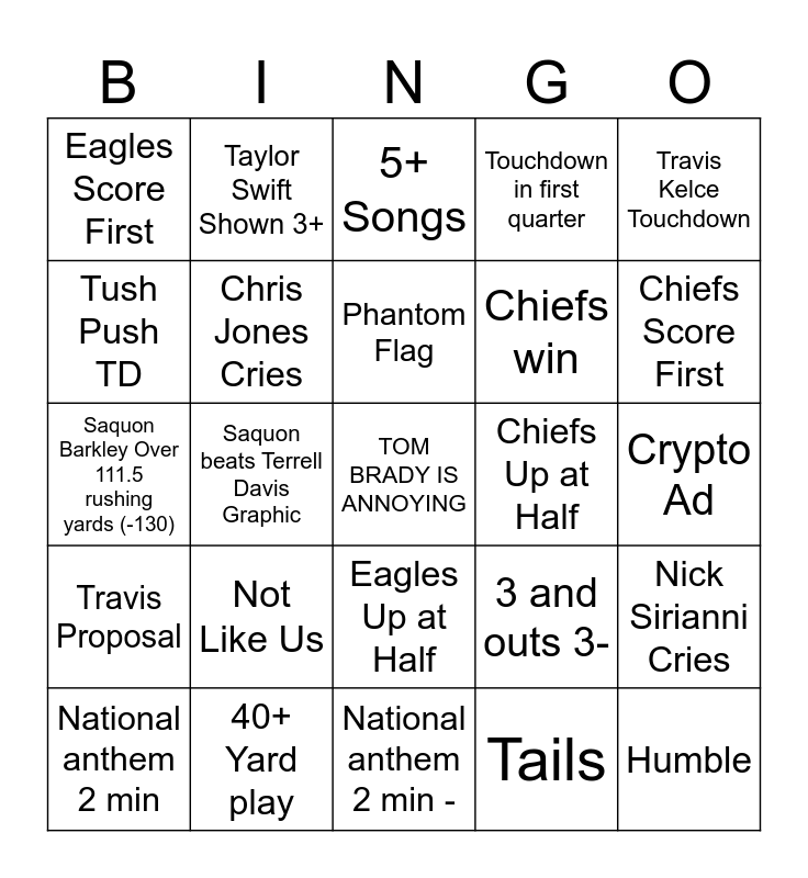 This bingo card has a free space and 37 words: Jason Kelce Shown, 5 Sports Gambling, MCU Actor In Ad (Not Trailer), Chris Jones Cries, Nick Sirianni Cries, Not Like Us, Phantom Flag, Saquon Barkley Touchdown, Travis Kelce Touchdown, AJ Brown Book Mention, Saquon beats Terrell Davis Graphic, Touchdown in first quarter, Humble, Crypto Ad, Tush Push TD, Travis Proposal, Opening Touchback, 5+ Songs, Eagles Up at Half, Chiefs Up at Half, Eagles Score First, Chiefs Score First, National anthem 2 min, National anthem 2 min -, Heads, Tails, Taylor Swift Shown 3+, Taylor Swift shown 3-, Trump shown 3+, Trump shown 3-, Xavier Worthy 7+ rushing yards, 40+ Yard play, Saquon Barkley Over 111.5 rushing yards (-130), 3 and outs 3+, 3 and outs 3-, Chiefs win and Eagles win.