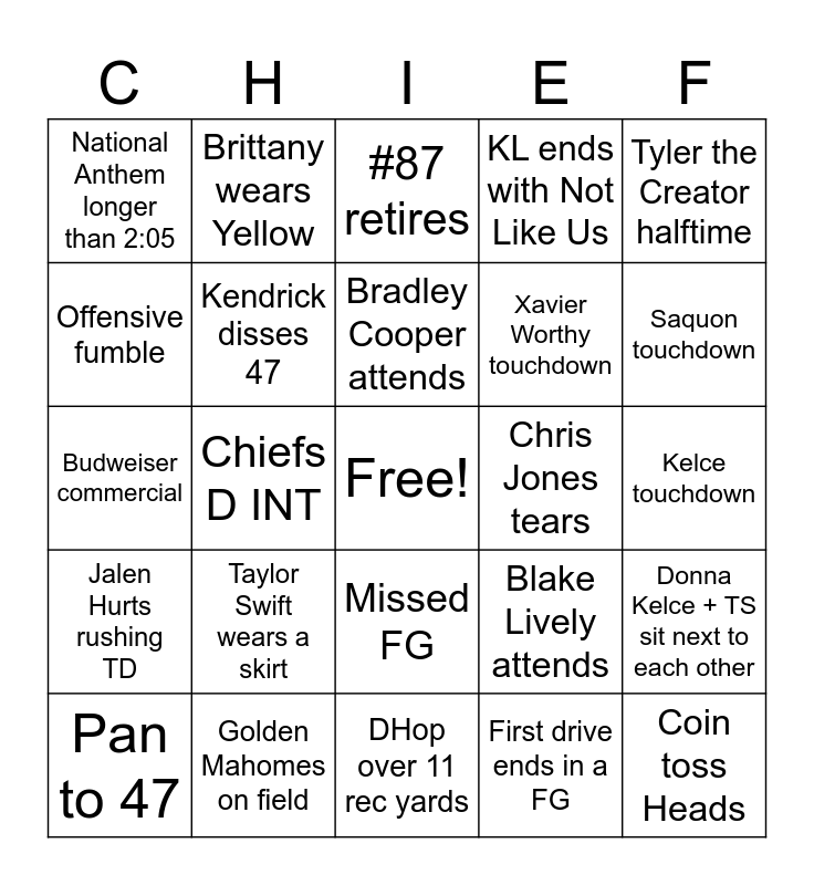This bingo card has a free space and 29 words: Pan to 47, Jason Kelce shirtless, Chiefs D INT, Coin toss Tails, National Anthem longer than 2:05, #87 retires, Kendrick disses 47, Taylor Swift wears a skirt, Chris Jones tears, Golden Mahomes on field, Kelce touchdown, Coin toss Heads, DHop over 11 rec yards, First drive ends in a FG, Saquon touchdown, Purple Gatorade, Missed FG, Jalen Hurts rushing TD, Tyler the Creator halftime, Budweiser commercial, Blake Lively attends, Over 48 total points, Xavier Worthy touchdown, Offensive fumble, KL ends with Not Like Us, Brittany wears Yellow, Donna Kelce + TS sit next to each other, Bradley Cooper attends and Ice Spice in TS Suite.