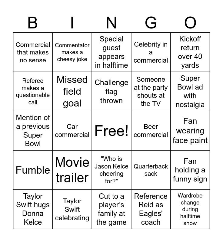 This bingo card has a free space and 36 words: Touchdown, Interception, Field goal, Missed field goal, Quarterback sack, Fumble, Challenge flag thrown, Pick-six, Kickoff return over 40 yards, Touchdown celebration dance, Car commercial, Celebrity in a commercial, Animal in a commercial, Beer commercial, Super Bowl ad with nostalgia, Commercial that makes no sense, Food commercial, Movie trailer, Wardrobe change during halftime show, Special guest appears in halftime, Fan wearing face paint, Fan holding a funny sign, Taylor Swift celebrating, Taylor Swift hugs Donna Kelce, Cut to a player’s family at the game, Commentator makes a cheesy joke, Mention of a previous Super Bowl, Drone shot of the stadium, Someone at the party shouts at the TV, Referee makes a questionable call, Bourbon Street is shown, Comparison of Mahomes to Brady, Reference Reid as Eagles' coach, "Who is Jason Kelce cheering for?", Holding penalty and Incomplete pass.