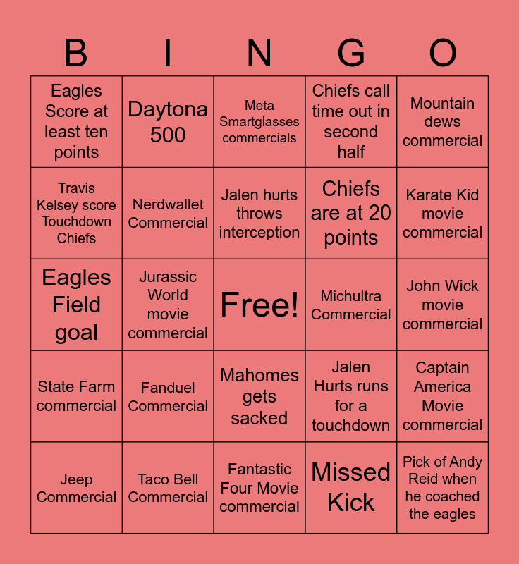 This bingo card has a free space and 24 words: Fanduel Commercial, Taco Bell Commercial, Jalen hurts throws interception, Jeep Commercial, Mountain dews commercial, Eagles Score at least ten points, Travis Kelsey score Touchdown Chiefs, Daytona 500, Michultra Commercial, Mahomes gets sacked, Chiefs are at 20 points, Eagles Field goal, Jalen Hurts runs for a touchdown, Captain America Movie commercial, Nerdwallet Commercial, Missed Kick, John Wick movie commercial, Meta Smartglasses commercials, Karate Kid movie commercial, Jurassic World movie commercial, Pick of Andy Reid when he coached the eagles, State Farm commercial, Chiefs call time out in second half and Fantastic Four Movie commercial.