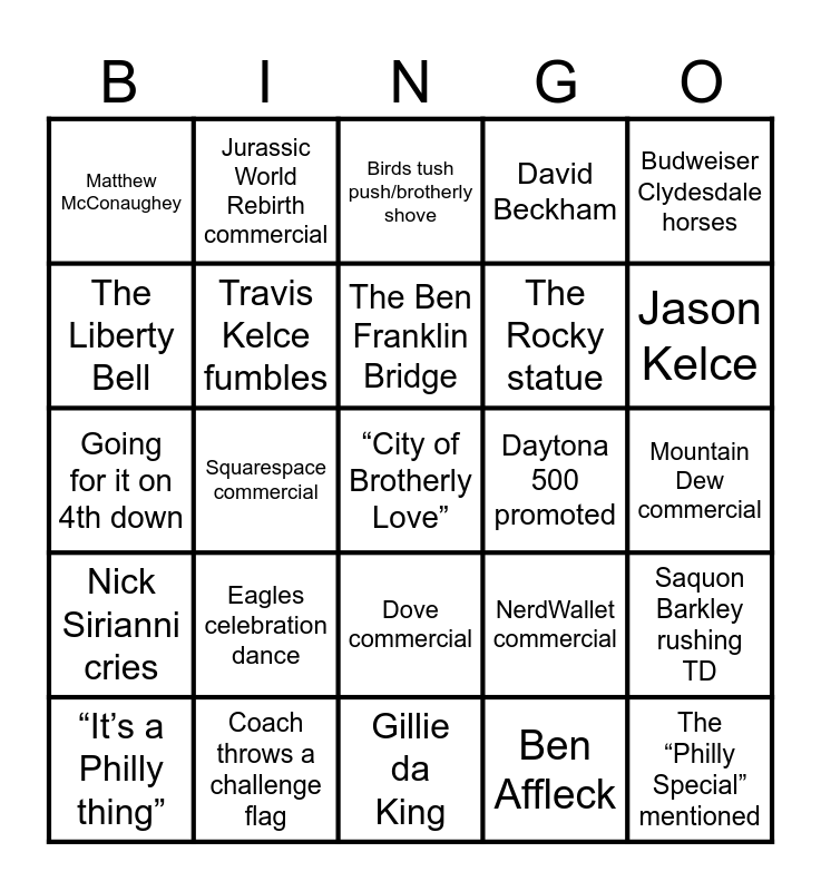 This bingo card has 43 words: Free!, “City of Brotherly Love”, “Inner Excellence” mention, “It’s a Philly thing”, Andy Reid flashback as Eagles coach, Ben Affleck, Birds tush push/brotherly shove, Bradley Cooper, Budweiser Clydesdale horses, Coach throws a challenge flag, David Beckham, Daytona 500 promoted, Dove commercial, Eagles celebration dance, FanDuel commercial, Gillie da King, GoDaddy commercial, Going for it on 4th down, Gritty or Phanatic appearance, Jason Kelce, Jurassic World Rebirth commercial, Mahomes gets sacked, Mahomes turns over the ball, Matthew McConaughey, Michelob Ultra commercial, Mountain Dew commercial, Muppets, Nerds Gummy Clusters commercial, NerdWallet commercial, Nick Sirianni cries, Post Malone, Saquon Barkley rushing TD, Snoop Dogg, Squarespace commercial, Taco Bell commercial, Taylor Swift, The “Philly Special” mentioned, The Ben Franklin Bridge, The Liberty Bell, The Rocky statue, The Smurfs movie commercial, Travis Kelce fumbles and TurboTax commercial.