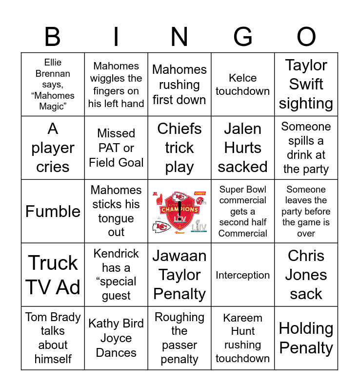 This bingo card has a free space and 29 words: Tom Brady talks about himself, Shot of New Orleans skyline, Mahomes sticks his tongue out, Travis Kelce Lateral, Ellie Brennan says, “Mahomes Magic”, Mahomes rushing first down, Missed PAT or Field Goal, Kendrick has a “special guest, Super Bowl commercial gets a second half Commercial, Kathy Bird Joyce Dances, Someone leaves the party before the game is over, Holding Penalty, Roughing the passer penalty, Kareem Hunt rushing touchdown, Someone spills a drink at the party, Fight on the Field, Jawaan Taylor Penalty, Truck TV Ad, Taylor Swift sighting, Fumble, Interception, Bud Light TV Ad, Jalen Hurts sacked, A player cries, Kelce touchdown, Mahomes wiggles the fingers on his left hand, Chris Jones sack, Chiefs trick play and Dancing in the endzone.