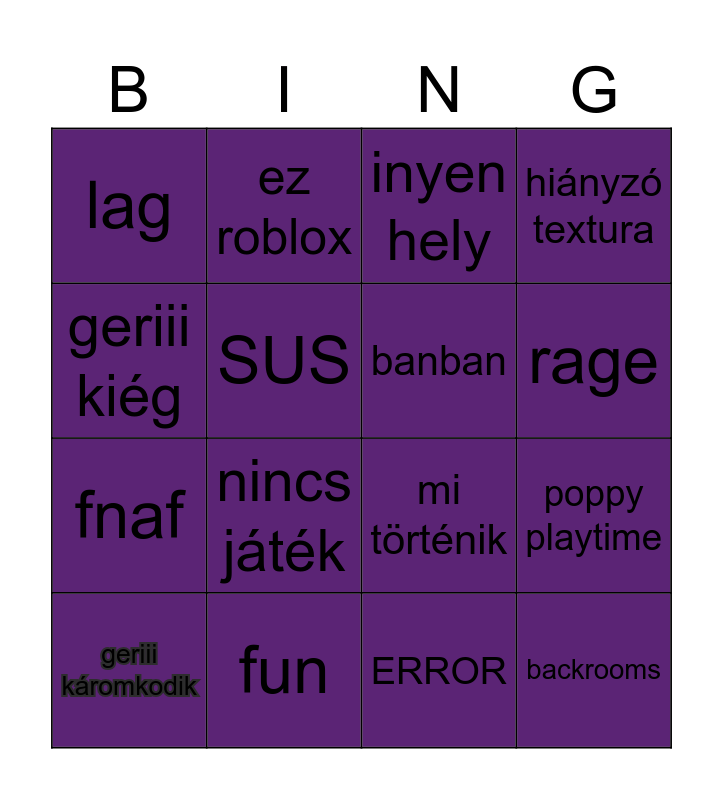 This bingo card has 16 words: fun, poppy playtime, inyen hely, lag, fnaf, ez roblox, mi történik, ERROR, geriii kiég, SUS, geriii káromkodik, hiányzó textura, nincs játék, rage, banban and backrooms.