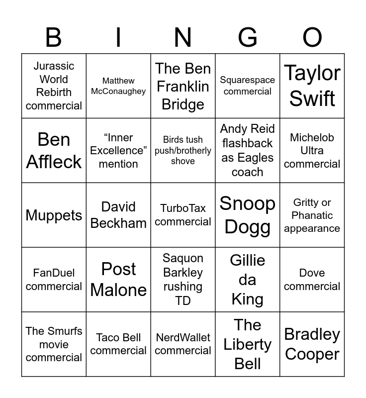 This bingo card has 43 words: Free!, TurboTax commercial, Travis Kelce fumbles, The Smurfs movie commercial, The Rocky statue, The Liberty Bell, The Ben Franklin Bridge, The “Philly Special” mentioned, Taylor Swift, Taco Bell commercial, Squarespace commercial, Snoop Dogg, Saquon Barkley rushing TD, Post Malone, Nick Sirianni cries, NerdWallet commercial, Nerds Gummy Clusters commercial, Muppets, Mountain Dew commercial, Michelob Ultra commercial, Matthew McConaughey, Mahomes turns over the ball, Mahomes gets sacked, Jurassic World Rebirth commercial, Jason Kelce, Gritty or Phanatic appearance, Going for it on 4th down, GoDaddy commercial, Gillie da King, FanDuel commercial, Eagles celebration dance, Dove commercial, Daytona 500 promoted, David Beckham, Coach throws a challenge flag, Budweiser Clydesdale horses, Bradley Cooper, Birds tush push/brotherly shove, Ben Affleck, Andy Reid flashback as Eagles coach, “It’s a Philly thing”, “Inner Excellence” mention and “City of Brotherly Love”.