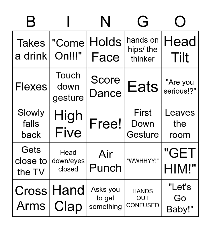 This bingo card has a free space and 24 words: Head down/eyes closed, Hand Clap, Score Dance, Cross Arms, Head Tilt, Takes a drink, Flexes, "Come On!!!", First Down Gesture, Air Punch, Eats, Slowly falls back, "WWHHYY!", "GET HIM!", Touch down gesture, HANDS OUT CONFUSED, Leaves the room, Holds Face, "Are you serious!?", High Five, "Let's Go Baby!", Gets close to the TV, hands on hips/ the thinker and Asks you to get something.