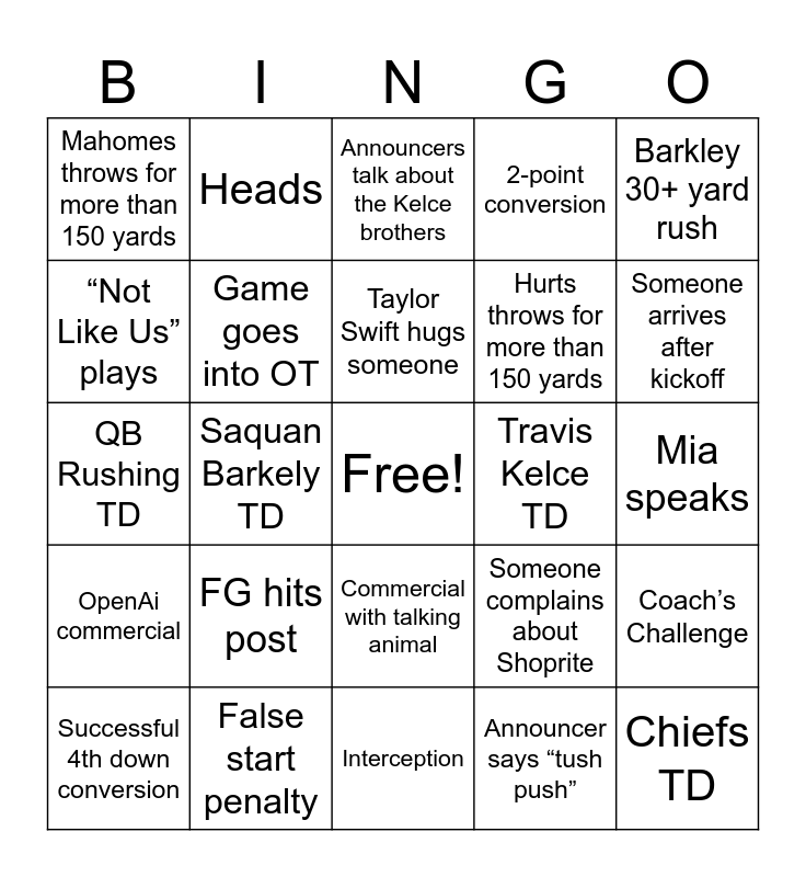 This bingo card has a free space and 49 words: Marcus gets angry, Chiefs TD, Eagles TD, Interception, FG hits post, Announcer says Drake, Heads, Fumble, “Not Like Us” plays, Coach SLAMS HEADSET, Game goes into OT, 2-point conversion, Coach’s Challenge, Someone complains about Shoprite, "Oh that's spicy" is said, Tails, Taylor Swift hugs someone, Travis Kelce TD, Safety, Barkley 30+ yard rush, Saquan Barkely TD, Announcer says “tush push”, Mahomes throws for more than 150 yards, Hurts throws for more than 150 yards, Jackson dances, Someone arrives after kickoff, Successful 4th down conversion, TD dance, Commercial with talking animal, OpenAi commercial, Kickoff return, Fake punt, An octopus occurs, First down measurement, False start penalty, Holding penalty, Player crying, Announcer brings up the Giants, Mia speaks, Pepsi commercial, Ollie barks, Commercial features a dog, Someone complains about parking, Hunt TD, QB Rushing TD, Announcers talk about the Kelce brothers, Eagles score first TD, Chiefs score first TD and A brewery is mentioned.