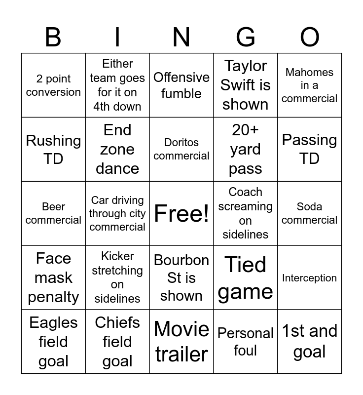 This bingo card has a free space and 29 words: Celebrity crowd shot (not TS), Chiefs field goal, Offensive fumble, False start penalty, Mahomes in a commercial, 2 point conversion, End zone dance, Doritos commercial, Coach screaming on sidelines, Interception, Eagles field goal, Car driving through city commercial, Personal foul, 1st and goal, Beer commercial, Holding, Movie trailer, Tied game, Passing TD, Face mask penalty, Kicker stretching on sidelines, Time out called, 20+ yard pass, Soda commercial, Rushing TD, Either team goes for it on 4th down, Bourbon St is shown, Taylor Swift is shown and Reversed call.