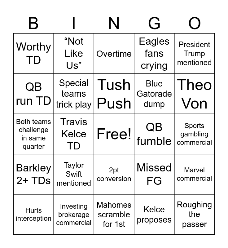 This bingo card has a free space and 24 words: Taylor Swift mentioned, Investing brokerage commercial, Tush Push, Hurts interception, President Trump mentioned, Worthy TD, QB run TD, “Not Like Us”, QB fumble, 2pt conversion, Blue Gatorade dump, Both teams challenge in same quarter, Missed FG, Marvel commercial, Special teams trick play, Kelce proposes, Sports gambling commercial, Overtime, Theo Von, Travis Kelce TD, Roughing the passer, Barkley 2+ TDs, Eagles fans crying and Mahomes scramble for 1st.
