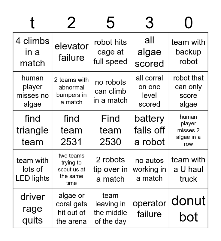 This bingo card has a free space and 39 words: dropped battery, 4 autos working in a match, 2 deep climbs in a match, 2 teams with abnormal bumpers in a match, driver rage quits, 2 robots tip over in a match, no robots can climb in a match, robot that can only score corral, team with backup robot, team with lots of LED lights, find team 2531, all algae scored, donut bot, human player misses 2 algae in a row, battery falls off a robot, two teams trying to scout us at the same time, coral or algae stuck on a robot, 4 climbs in a match, 2 disabled robots in a match, no autos working in a match, human player misses no algae, team leaving in the middle of the day, all corral on one level scored, robot that can only score algae, free space number 2530, robot that shoots algae into the barge, all ranking points gained in a match, programming failure in a match, robot falls over and tips itself back up, elevator failure, team argument in the pits, team with a tent, robot hits cage at full speed, algae or coral gets hit out of the arena, operator failure, popped ball, team with a U haul truck, find triangle team and scout over 7 teams.