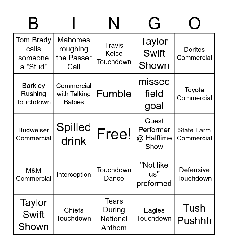 This bingo card has a free space and 24 words: Taylor Swift Shown, Interception, Fumble, Eagles Touchdown, Doritos Commercial, Tom Brady calls someone a "Stud", Mahomes roughing the Passer Call, Travis Kelce Touchdown, Guest Performer @ Halftime Show, State Farm Commercial, Budweiser Commercial, Commercial with Talking Babies, "Not like us" preformed, Defensive Touchdown, Barkley Rushing Touchdown, Chiefs Touchdown, Tears During National Anthem, Taylor Swift Shown, Toyota Commercial, M&M Commercial, Spilled drink, Touchdown Dance, missed field goal and Tush Pushhh.