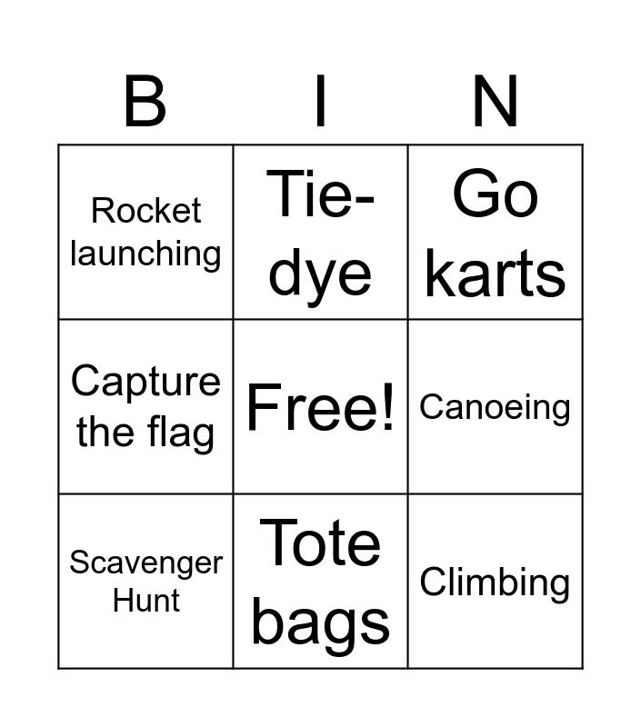 This bingo card has a free space and 15 words: Nightline, Caving, Go karts, Rocket launching, Tote bags, Climbing, Archery, Rock Hopping, Canoeing, Campfire, Orienteering, Capture the flag, Scavenger Hunt, Tie-dye and Movie night.