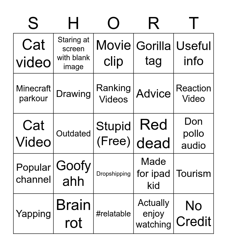 This bingo card has 1 images, a free space and 58 words: Brain rot, Content farm, Popular channel, Actually enjoy watching, Comment glazing, Drawing, Explaining the video, Advice, Less than 1k likes, Gorilla tag, Roblox, Minecraft parkour, R/AskReddit, Ai, Cat video, No Credit, Useful info, Well made, Ranking Videos, Red dead, Movie clip, Yapping, Tourism, Non english, Sigma edit, Scariest stories, Voice filter, Reaction Video, Gta, ElsaGate Level, Sprunki, Tv Show, Family guy funnies, Staring at screen with blank image, less than 100 comments, Released this month, Outdated, Unfunny (Free), Cat Video, Compilation, Goofy ahh, Don pollo audio, Court video, Brain healing, Calming, Asmr, "life hack", Dropshipping, #relatable, dumb ahh, What even is this, I dont like this at all, So sad!! :(, Manchild, Made for ipad kid, Half and half, Funny stories and Bullying.