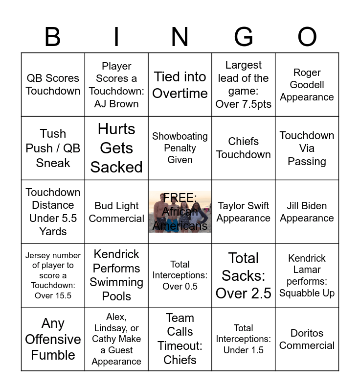 This bingo card has a free space and 84 words: Coach Challenge, Endzone Dance, Tied into Overtime, 2-Point Convsersion, Eagles Throw Interception, Any Team Scores 20+, Touchdown Over 40 Yards, False Start Penalty, Eagles Field Goal, Defensive Touchdown, Reversed Call, Any Team Go For It on 4th, Hurts Gets Sacked, Taylor Swift Appearance, Missed Field Goal, QB Scores Touchdown, Any Offensive Fumble, Tush Push / QB Sneak, Chiefs Field Goal, Mahomes Gets Sacked, Eagles Touchdown, Chiefs Touchdown, Doritos Commercial, Chiefs Throw Interception, Bud Light Commercial, Temu Commercial, Something Uri Thinks is Crazy but No One Else Understands Happens, Topless Fan, Someone Throws a Punch, Kendrick Performs Not Like Us, Kendrick Performs Swimming Pools, Touchdown Via Rushing, Total Songs Played at Halftime Over 5.5, Touchdown Distance Under 5.5 Yards, Team Commits Penalty: Eagles, Team Commits Penalty: Chiefs, Team Calls Timeout: Chiefs, Team Calls Timeout: Eagles, Touchdown Via Passing, Jersey number of player to score a Touchdown: Over 15.5, Coach's Challenge: Eagles, Coach's Challenge: Chiefs, Longest Touchdown: Over 20.5yds, Total Kareem Hunt rushing: Over 8.5 carries, Halftime Show: Kendrick Lamar Changes outfit, Total Dallas Goedert receiving: Over 38.5yds, Player Scores a Touchdown: AJ Brown, Team Calls a Timeout: Eagles, Team Calls a Timeout: Chiefs, Total Pat Mahomes passing: Over 217.5yds, Player Scores a Touchdown: Travis Kelce, Total Sacks: Over 2.5, Largest lead of the game: Over 7.5pts, Jannina Asks Uri a Question, James Asks Uri a Question, Maahiya Asks Uri a Question, Alex, Lindsay, or Cathy Make a Guest Appearance, Showboating Penalty Given, President Donald J. Trump, our Lord and Savior of the Free Nation, Blesses us With an Appearance, Jill Biden Appearance, Will Smith Appearance, Brad Pitt Appearance, Henry Cavill Appearance, Chiefs Explosive Play yds: Pass Over 19.5, Eagles Explosive Play yds: Rush Over 9.5, Kickoff or Punt: Touchback, Injury, Purple Gatorade, Roger Goodell Appearance, Total Saquon Barkley rushing: Over 18.5 carries, Kendrick Lamar performs: Squabble Up, Total Devonta Smith receiving: Over 3.5 receptions, Total 4th down conversions: Over 0.5, Jersey number of player to score a Touchdown: Under 15.5, Total Interceptions: Over 0.5, Total Interceptions: Under 1.5, Total Punts Over 3.5, Total Field goals made: Over 1.5, Second Half Touchdown: Chiefs, Second Half Touchdown: Eagles, Player Scores a Touchdown: Devonta Smith, Kickoff or Punt: Returned or Fair catch, Second Half Touchdown: Chiefs and Second Half Touchdown: Eagles.