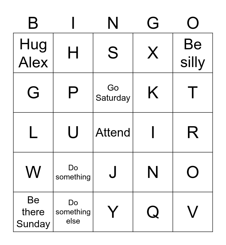 This bingo card has a free space and 24 words: Do something, Do something else, Go Saturday, Be there Sunday, Be silly, Hug Alex, G, H, I, J, K, L, N, O, P, Q, R, S, T, U, V, W, X and Y.