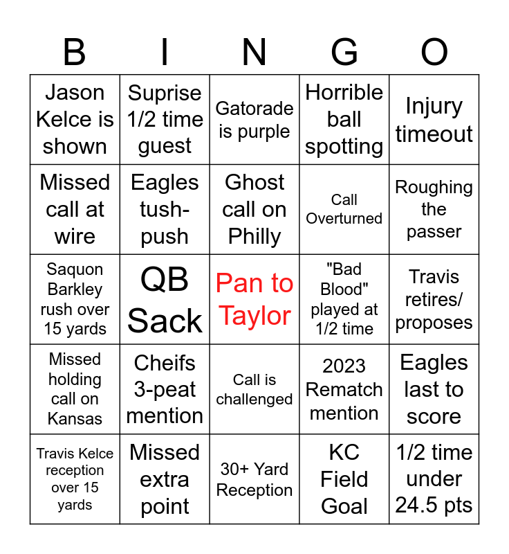 This bingo card has a free space and 24 words: Cheifs 3-peat mention, Missed extra point, Ghost call on Philly, Travis Kelce reception over 15 yards, Injury timeout, Jason Kelce is shown, Missed call at wire, Suprise 1/2 time guest, "Bad Blood" played at 1/2 time, Call is challenged, Call Overturned, Saquon Barkley rush over 15 yards, 2023 Rematch mention, Eagles last to score, Eagles tush-push, KC Field Goal, Travis retires/ proposes, Gatorade is purple, Roughing the passer, QB Sack, 1/2 time under 24.5 pts, Missed holding call on Kansas, Horrible ball spotting and 30+ Yard Reception.