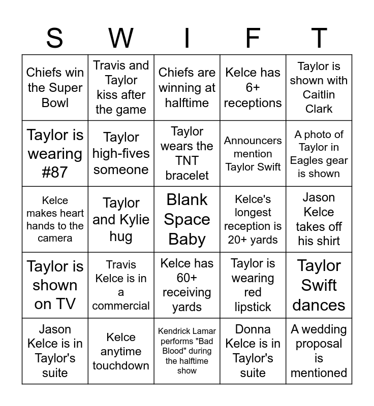 This bingo card has a free space and 44 words: Taylor wearing Chiefs logo, A wedding proposal is mentioned, Taylor is shown during the National Anthem, Jason Kelce is in Taylor's suite, Kylie Kelce is in Taylor's suite, Donna Kelce is in Taylor's suite, Chiefs are winning at halftime, Taylor is shown with Brittany Mahomes, Taylor is shown with Caitlin Clark, Kelce anytime touchdown, Kelce has 6+ receptions, Kelce's longest reception is 20+ yards, Kelce has 60+ receiving yards, Travis Kelce is in a commercial, Taylor Swift song is played during a commercial, Kendrick Lamar performs "Bad Blood" during the halftime show, Taylor is shown during the halftime show, Kelce makes heart hands to the camera, Taylor is shown over 5+ times during the game, A photo of Taylor in Eagles gear is shown, Travis and Taylor kiss after the game, Taylor is on the field after the game, Kelce wins MVP, Chiefs win the Super Bowl, Mahomes gets sacked, Jason Kelce takes off his shirt, Chiefs challenge a play and announcers mention Taylor, Someone complains about Taylor Swift, Taylor is wearing red lipstick, Taylor is shown on TV, Taylor waves to the camera, Taylor Swift dances, Taylor does a hand heart, Taylor hugs Brittany Mahomes, Taylor and Kylie hug, Taylor Swift & Mama Donna moment, Taylor Swift sign in the stands is shown, Taylor covers her mouth in excitement, Taylor wears the TNT bracelet, Taylor is wearing #87, Announcers mention Taylor Swift, Taylor is called Travis' wife, Taylor high-fives someone and Taylor Swift is wearing red.