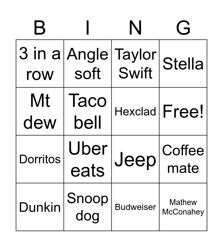 This bingo card has 17 words: Budweiser, Dunkin, Taylor Swift, 3 in a row, Uber eats, Stella, Coffee mate, Hexclad, Free!, Taco bell, Snoop dog, Jeep, Mt dew, Angle soft, Dorritos, Payton Manning and Mathew McConahey.