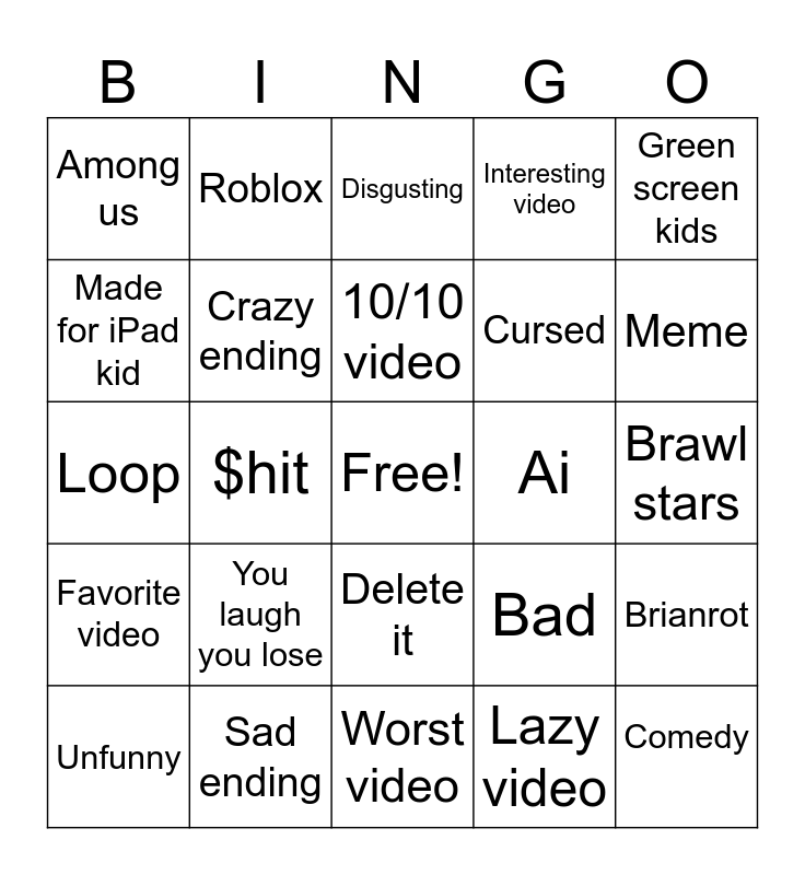 This bingo card has a free space and 24 words: Unfunny, You laugh you lose, 10/10 video, Lazy video, Green screen kids, Among us, Roblox, Disgusting, Ai, Brawl stars, Loop, Crazy ending, Bad, Brianrot, Made for iPad kid, Sad ending, Worst video, Interesting video, Meme, Favorite video, $hit, Delete it, Cursed and Comedy.