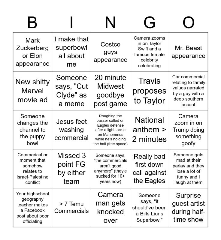This bingo card has a free space and 24 words: Missed 3 point FG by either team, > 7 Temu Commercials, 20 minute Midwest goodbye post game, Your highschool geography teacher makes a Facebook post about poor officiating, Mr. Beast appearance, Mark Zuckerberg or Elon appearance, New shitty Marvel movie ad, I make that superbowl all about me, National anthem > 2 minutes, Someone says, "the commercials aren't good anymore" (they'e sucked for 10+ years now), Travis proposes to Taylor, Someone changes the channel to the puppy bowl, Really bad first down call against the Eagles, Someone gets mad at their parlay and they lose a lot of funny and I laugh at them, Someone says, "Cut Clyde" as a meme, Someone says, "it should've been a Bills Lions Superbowl", Camera zoom in on Trump doing something goofy, Costco guys appearance, Car commercial relating to family values narrated by a guy with a deep southern accent, Jesus feet washing commercial, Surprise guest artist during half-time show, Commerical or moment that somehow relates to Israel-Palestine conflict, Camera zooms in on Taylor Swift and a famous female celebrity celebrating and Camera man gets knocked over.