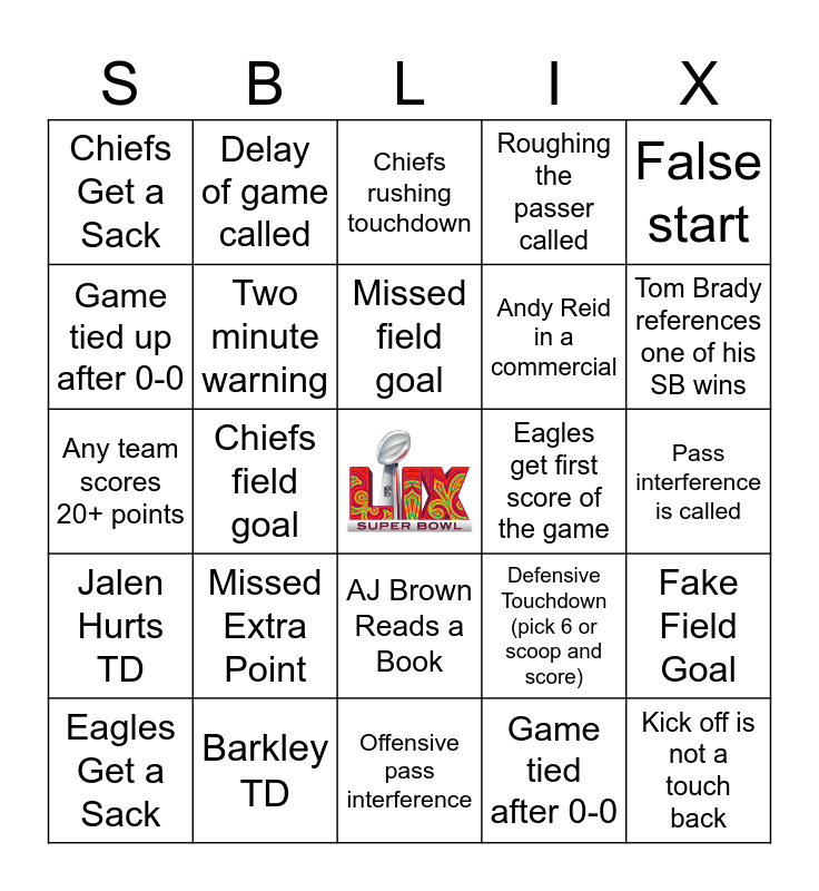 This bingo card has a free space and 77 words: Chiefs passing touchdown, Eagles passing touchdown, Chiefs rushing touchdown, Eagles rushing touchdown, Defensive stop on 4th down, Taylor Swift shown, Offensive fumble & defensive recovery, Trick play, Touchdown over 40 yards, Tush push, Chiefs throw interception, Eagles throw interception, Missed field goal, Game tied up after 0-0, Eagles field goal, Chiefs field goal, End zone dance, Kick off is not a touch back, Challenge flag thrown, False start, End of quarter, Any team scores 20+ points, Two minute warning, Delay of game called, Roughing the passer called, Travis Kelce reception over 15 yards, Saquon Barkley rush over 15 yards, Eagles timeout, Chiefs timeout, Kendrick Lamar halftime show, Chiefs win, Eagles win, Special Teams Touchdown, Defensive Touchdown (pick 6 or scoop and score), Tom Brady references one of his SB wins, Andy Reid in a commercial, Mahomes appears in a commercial, Kelce Appears in a commercial, Pass interference is called, Game tied after 0-0, 2 pt conversion Attempt, Eagles fumble, "Three Peat", Chiefs lead at halftime, Half Time Total Combined Score = Even, Half Time Total Combined Score = Odd, Eagles Get a Sack, Chiefs Get a Sack, Eagles Lead at Halftime, Chiefs fumble, Successful tush push, AJ Brown Reads a Book, Punt over 40 yds, Punt inside the 10 yd line, Fake Punt, Onside Kick, Offensive holding, Saquan hurdles defender, "GOAT" mentioned, Field goal attempt hits uprights, Missed Extra Point, Chiefs receive opening kick off, Eagles receive opening kick off, Coin toss is Heads, Coin toss is tails, Game Tied at half time, Chiefs get first score of the game, Eagles get first score of the game, First Score is Field Goal, First Score is Touchdown, Patrick Mahomes TD, Fake Field Goal, Jalen Hurts TD, Barkley TD, Failed 4th down conversion, Offensive pass interference and Defensive pass interference.