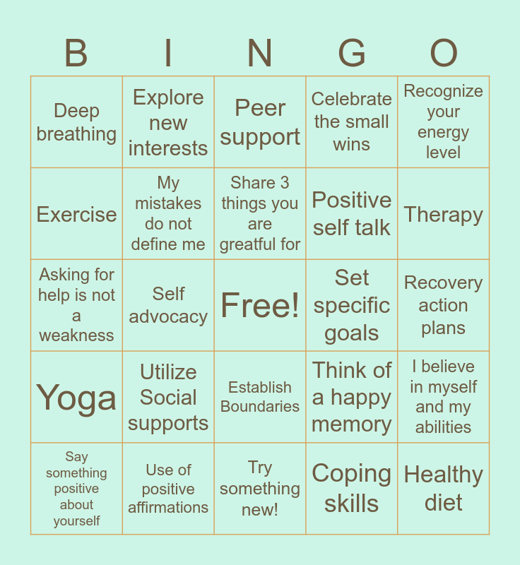 This bingo card has a free space and 24 words: Utilize Social supports, Use of positive affirmations, Share 3 things you are greatful for, Say something positive about yourself, Recognize your energy level, Deep breathing, Exercise, Explore new interests, Set specific goals, Establish Boundaries, Positive self talk, Asking for help is not a weakness, Think of a happy memory, I believe in myself and my abilities, My mistakes do not define me, Coping skills, Recovery action plans, Peer support, Therapy, Self advocacy, Healthy diet, Yoga, Celebrate the small wins and Try something new!.