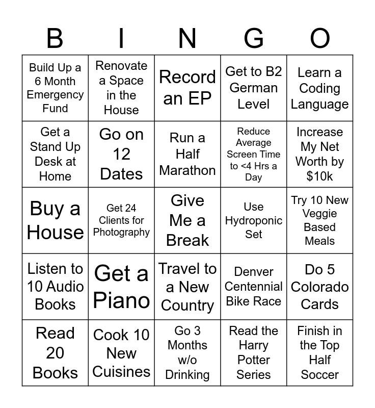 This bingo card has a free space and 24 words: Get a Piano, Cook 10 New Cuisines, Run a Half Marathon, Read 20 Books, Learn a Coding Language, Build Up a 6 Month Emergency Fund, Get a Stand Up Desk at Home, Renovate a Space in the House, Use Hydroponic Set, Travel to a New Country, Reduce Average Screen Time to <4 Hrs a Day, Buy a House, Denver Centennial Bike Race, Do 5 Colorado Cards, Go on 12 Dates, Read the Harry Potter Series, Try 10 New Veggie Based Meals, Record an EP, Increase My Net Worth by $10k, Get 24 Clients for Photography, Finish in the Top Half Soccer, Listen to 10 Audio Books, Get to B2 German Level and Go 3 Months w/o Drinking.