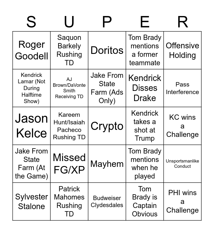 This bingo card has 75 words: Taylor Swift, Jaylen Hurts Passing TD, Jake From State Farm (Ads Only), Trump Gets Booed, Refs Mic doesn't work, Kevin Hart, Patrick Mahomes Passing TD, Flo/Dr. Rick, Butker Misses Wide Right, Bad Call in favor of KC, Drake, Jaylen Hurts Rushing TD, Mayhem, Kendrick Disses Drake, Bad Call in favor of PHI, Kendrick Lamar (Not During Halftime Show), Patrick Mahomes Rushing TD, Budweiser Clydesdales, Tom Brady Says Something Awkward, Pass Interference, Drake, Saquon Barkely Rushing TD, Crypto, Tom Brady mentions a former teammate, Offensive Holding, LeBron James, Travis Kelce Receiving TD, Taxes, Mahomes Flops, Defensive Holding, Zion Williamson, Saquon Barkley Receiving TD, Snickers, Tom Brady mentions when he played, KC wins a Challenge, Roger Goodell, KC Defensive TD, Pepsi, Kendrick takes a shot at Trump, PHI wins a Challenge, Drew Brees, PHI Defensive TD, Coke, Trump complains about Kendrick's Performance, Offsides, Encroachment, NZI, Paul Rudd, Kareem Hunt/Isaiah Pacheco Rushing TD, Doritos, Tom Brady needs a Thesaurus, False Start, Dawn Staley, AJ Brown/DaVonte Smith Receiving TD, NO/LA Tourism, Tom Brady Yells, Ineligble Man Down Field, Brittany Mahomes, JuJu Smith-Schuster Receiving TD, Popeye's, Tom Brady criticizes a QB, Delay of Game, Sylvester Stalone, Dallas Goedert Receiving TD, Stop Hate, Tom Brady praises a QB, Illegal Substitution, Jason Kelce, Xavier Worthy Receiving TD, Whopper Whopper Whopper Whopper, Tom Brady smiling and staring with dead eyes at Kevin Burkart, Unsportsmanlike Conduct, Jake From State Farm (At the Game), Missed FG/XP, Discover, Tom Brady is Captain Obvious and Roughing the Passer.