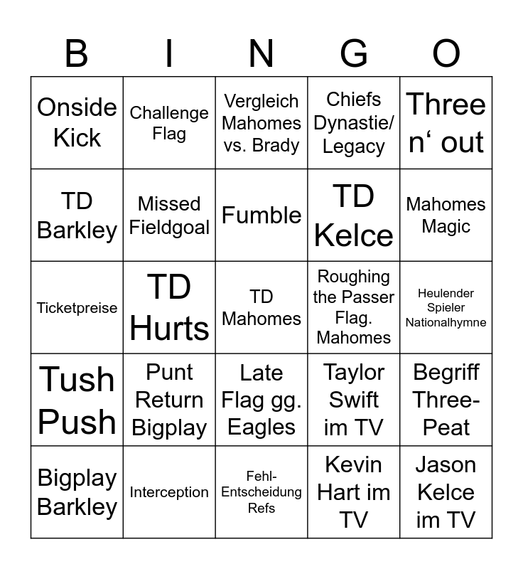 This bingo card has 25 words: Punt Return Bigplay, Fehl-Entscheidung Refs, Fumble, Bigplay Barkley, Three n‘ out, Onside Kick, TD Barkley, Challenge Flag, Roughing the Passer Flag. Mahomes, Late Flag gg. Eagles, TD Kelce, Ticketpreise, Taylor Swift im TV, Begriff Three-Peat, Missed Fieldgoal, Jason Kelce im TV, Heulender Spieler Nationalhymne, Vergleich Mahomes vs. Brady, Mahomes Magic, TD Hurts, TD Mahomes, Interception, Tush Push, Chiefs Dynastie/ Legacy and Kevin Hart im TV.