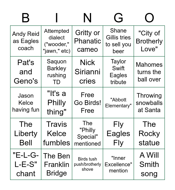 This bingo card has a free space and 25 words: Travis Kelce fumbles, Birds tush push/brotherly shove, Nick Sirianni cries, "E-L-G-L-E-S" chant, "City of Brotherly Love", Andy Reid as Eagles coach, Pat's and Geno's, Attempted dialect ("wooder," "jawn," etc), "Abbott Elementary", The "Philly Special" mentioned, Taylor Swift Eagles tribute, Jason Kelce having fun, Fly Eagles Fly, The Rocky statue, Saquon Barkley rushing TD, "It's Always Sunny", Throwing snowballs at Santa, Gritty or Phanatic cameo, Mahomes turns the ball over, "It's a Philly thing", A Will Smith song, The Ben Franklin Bridge, The Liberty Bell, Shane Gillis tries to sell you beer and "Inner Excellence" mention.