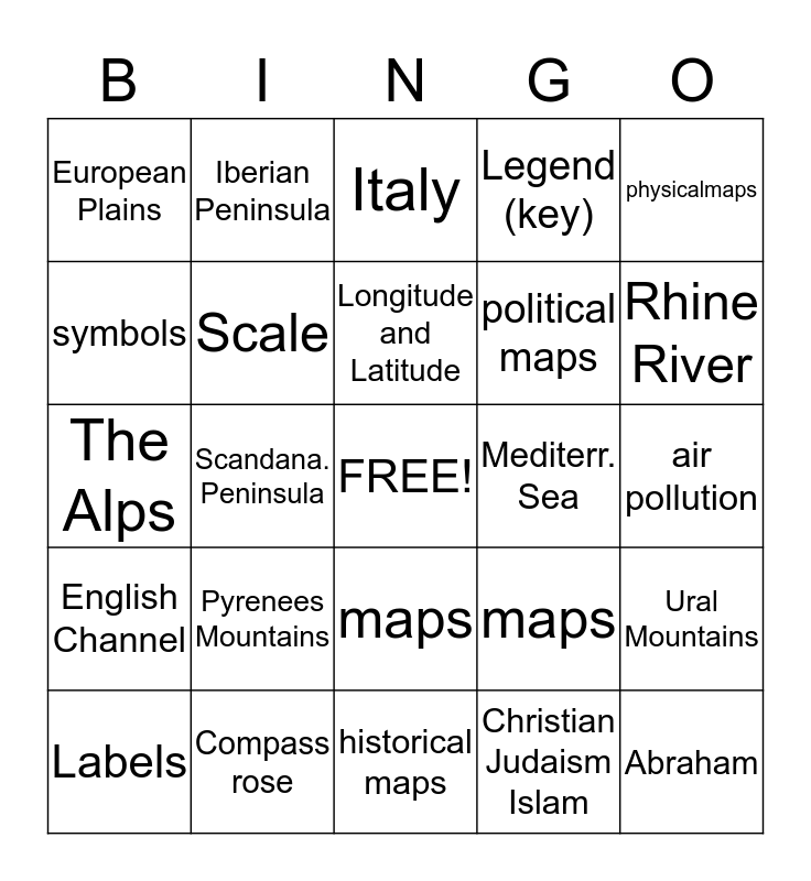This bingo card has a free space and 27 words: maps, physical maps, political maps, historical maps, symbols, Italy, Iberian Peninsula, English Channel, Mediterr. Sea, Ural Mountains, The Alps, Legend (key), Labels, Compass rose, Rhine River, Danube River, Scale, Longitude and Latitude, Pyrenees Mountains, European Plains, air pollution, Christian Judaism Islam, Scandana. Peninsula, Abraham, maps, physicalmaps and politicalmaps.