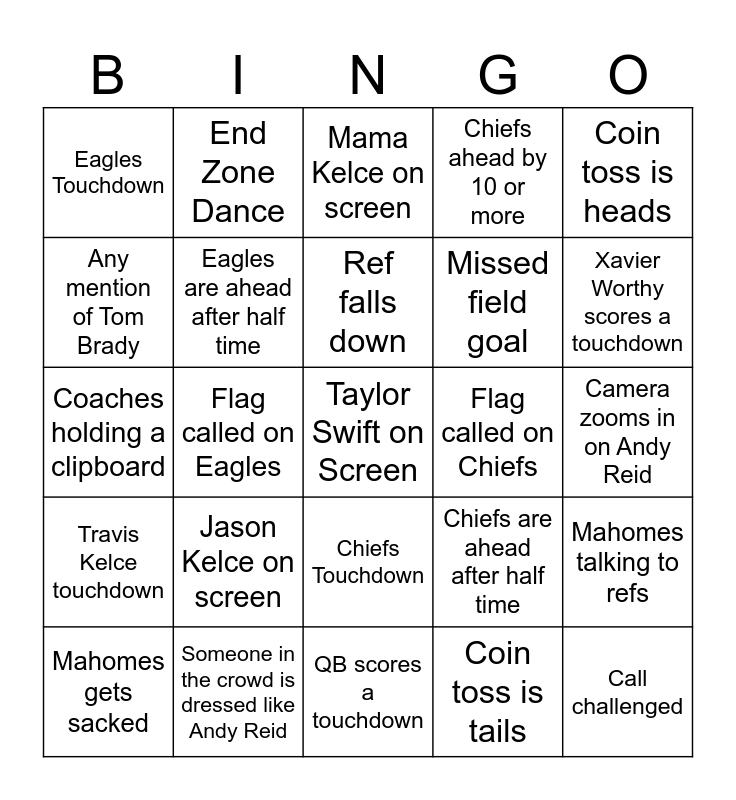 This bingo card has a free space and 24 words: Jason Kelce on screen, Someone in the crowd is dressed like Andy Reid, Ref falls down, Mahomes gets sacked, Coin toss is heads, Eagles Touchdown, Any mention of Tom Brady, End Zone Dance, Flag called on Chiefs, Chiefs Touchdown, Missed field goal, Coaches holding a clipboard, Chiefs are ahead after half time, Mahomes talking to refs, Eagles are ahead after half time, Coin toss is tails, Camera zooms in on Andy Reid, Mama Kelce on screen, Xavier Worthy scores a touchdown, Flag called on Eagles, Call challenged, Travis Kelce touchdown, Chiefs ahead by 10 or more and QB scores a touchdown.