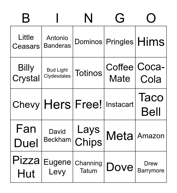 This bingo card has a free space and 51 words: Meg Ryan, Drew Barrymore, Willem Dafoe, Channing Tatum, David Beckham, Matthew McConaughy, Antonio Banderas, Chris Hemsworth, Billy Crystal, Doritos, Bud Light Clydesdales, Pringles, Amazon, Meta, Uber Eats, Coors Light, Totinos, Instacart, Haagen-Dazs, Hims, Hers, Dove, Little Ceasars, Coffee Mate, Michelob, Stella Artois, Coca-Cola, Pepsi, Pizza Hut, Dominos, Oreos, Snoop Dogg, Tom Brady, Kermit, Miss Piggy, Eugene Levy, Gordon Ramsey, Wanda Sykes, Peyton Manning, Eli Manning, Taco Bell, Fan Duel, Little Ceasers, Reese's, Turbo Tax, Dodge, Chevy, Ford, Mountain Dew, Lays Chips and Jeep.