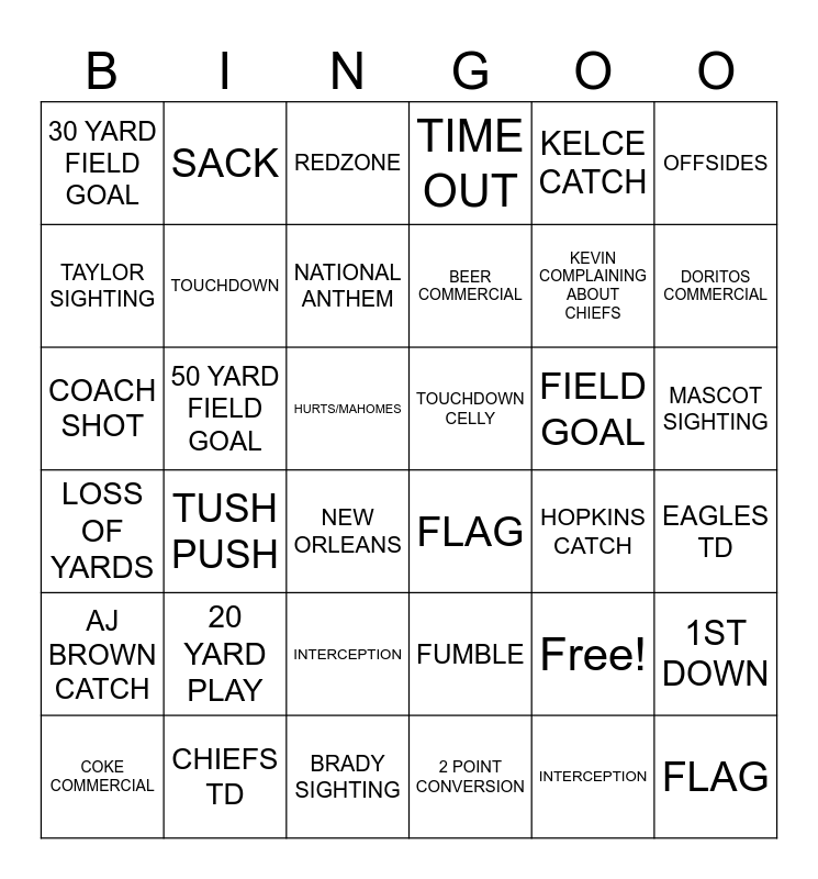 This bingo card has 37 words: Free!, FUMBLE, INTERCEPTION, TAYLOR SIGHTING, TUSH PUSH, FIELD GOAL, TOUCHDOWN, 2 POINT CONVERSION, KELCE CATCH, COKE COMMERCIAL, DORITOS COMMERCIAL, TIME OUT, COACH SHOT, HURTS/MAHOMES, OFFSIDES, TOUCHDOWN CELLY, 20 YARD PLAY, REDZONE, MASCOT SIGHTING, 50 YARD FIELD GOAL, 30 YARD FIELD GOAL, BEER COMMERCIAL, NEW ORLEANS, HOPKINS CATCH, CHIEFS TD, EAGLES TD, SACK, BRADY SIGHTING, 1ST DOWN, INTERCEPTION, MAHOMES INFATUATION, FLAG, KEVIN COMPLAINING ABOUT CHIEFS, AJ BROWN CATCH, LOSS OF YARDS, NATIONAL ANTHEM and FLAG.