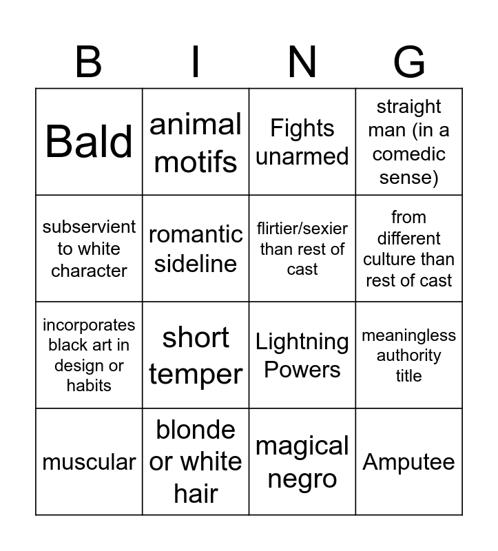 This bingo card has 18 words: short temper, Amputee, Fights unarmed, Bald, Lightning Powers, straight man (in a comedic sense), muscular, animal motifs, from different culture than rest of cast, incorporates black art in design or habits, magical negro, subservient to white character, meaningless authority title, romantic sideline, flirtier/sexier than rest of cast, blonde or white hair, blonde or white hair and flirtier/sexier than rest of cast.