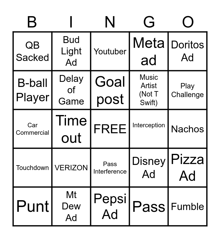 This bingo card has a free space and 44 words: Travis Kelce, Fumble, Coke Ad, Punt, FAST FOOD, Pass, Youtuber, MOVIE TRAILER, Doritos Ad, Mt Dew Ad, Meta ad, Interception, Pass Interference, VERIZON, Famous Actor, Pepsi Ad, T Swift, Car Commercial, Trick Play, Play Challenge, Bud Light Ad, Missed Field Goal, Billionaire, QB Sacked, Patrick Mahomes, Nachos, Wings, Jason Kelce, Disney Ad, Touchdown, Offsides, Pizza Ad, Nike Ad, Turnover, Time out, Hot Dog, Gatorade bucket, 5 Yard Penalty, Goal post, B-ball Player, Music Artist (Not T Swift), Tom Brady, Delay of Game and Ref Get's hit.