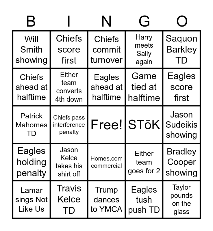 This bingo card has a free space and 44 words: Challenge flag is thrown, Taylor pounds on the glass, Taylor hugs Jason Kelce, Lamar sings Not Like Us, Jalen Hurts TD, Eagles tush push TD, Chiefs commit turnover, Eagles commit turnover, Saquon Barkley TD, Travis Kelce TD, Harry meets Sally again, STōK, Homes.com commercial, Jason Kelce takes his shirt off, FanDuel event, Trump dances to YMCA, Door Dash commercial, Patrick Mahomes TD, Missed Field Goal, Eagles score first, Chiefs score first, Liquid Death commercial, Eagles pass interference penalty, Will Smith showing, Sylvester Stallone showing, Jason Sudeikis showing, Jill Biden showing, NerdWallet commercial, Either team goes for 2, Eagles holding penalty, Poppi commercial, Bradley Cooper showing, Dunkin commercial, Game tied at 10 or more points, Chiefs pass interference penalty, Chiefs holding penalty, Mahomes gets sacked, Hurts get sacked, Eagles ahead at halftime, Chiefs ahead at halftime, Game tied at halftime, Fake punt attempt, Either team converts 4th down and Coffee Mate commercial.