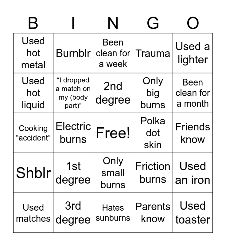 This bingo card has a free space and 24 words: 1st degree, 3rd degree, 2nd degree, Used matches, Used a lighter, Used hot metal, Used hot liquid, Burnblr, Polka dot skin, Only small burns, Only big burns, Cooking “accident”, Friction burns, Used an iron, “I dropped a match on my (body part)”, Parents know, Friends know, Been clean for a week, Been clean for a month, Electric burns, Used toaster, Shblr, Trauma and Hates sunburns.