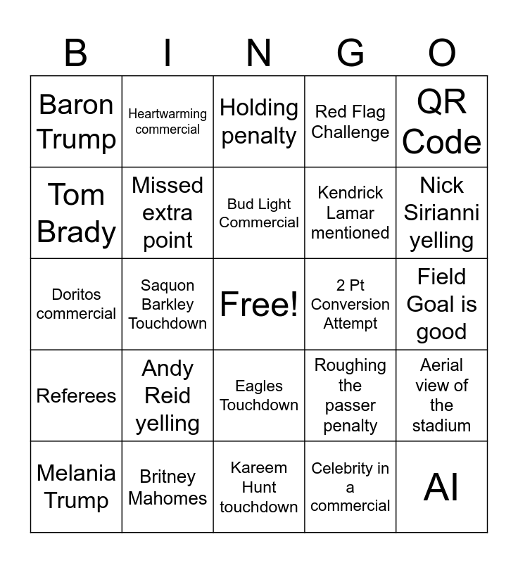 This bingo card has a free space and 42 words: Taylor Swift, Bud Light Commercial, Interception, Andy Reid yelling, Celebrity in a commercial, Aerial view of the stadium, AI, New Orleans, Holding penalty, Eagles Touchdown, Field Goal is good, Nick Sirianni yelling, Saquon Barkley Touchdown, QR Code, Retired football player, Roughing the passer penalty, 3-peat, Doritos commercial, Buffalo Bills mentioned, Heartwarming commercial, Tom Brady, Chiefs Touchdown, Missed field goal, Baron Trump, Commercial with a dog, Chicken Wings, Kendrick Lamar mentioned, MVP, Lombardi Trophy, Cheerleaders, Fireworks, Referees, Missed extra point, Kareem Hunt touchdown, Trump Dance, Melania Trump, Britney Mahomes, 2 Pt Conversion Attempt, One-Handed Catch, Quarterback Sack, Red Flag Challenge and Play Review.