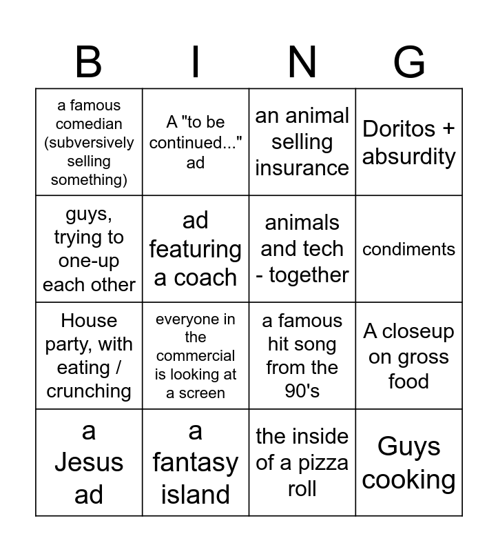 This bingo card has 20 words: A closeup on gross food, Horses + beer, an animal selling insurance, Dudes with a cooler, a Jesus ad, guys, trying to one-up each other, a fantasy island, a famous comedian (subversively selling something), House party, with eating / crunching, A "to be continued..." ad, everyone in the commercial is looking at a screen, a famous hit song from the 90's, ad featuring a coach, Guys cooking, animals and tech - together, Trucks, condiments, Doritos + absurdity, the inside of a pizza roll and Martha stewart.
