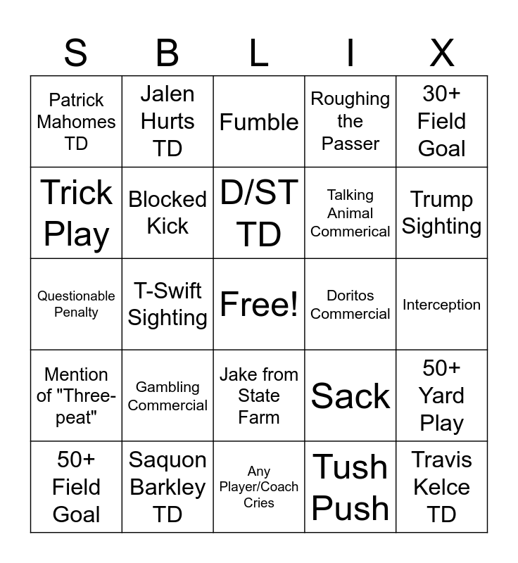 This bingo card has a free space and 25 words: Gambling Commercial, Any Player/Coach Cries, D/ST TD, 50+ Field Goal, 30+ Field Goal, Patrick Mahomes TD, Trick Play, Jalen Hurts TD, Doritos Commercial, Jake from State Farm, Talking Animal Commerical, Questionable Penalty, Sack, 50+ Yard Play, Blocked Kick, Snickers Commercial, Interception, Fumble, Trump Sighting, T-Swift Sighting, Travis Kelce TD, Saquon Barkley TD, Mention of "Three-peat", Roughing the Passer and Tush Push.