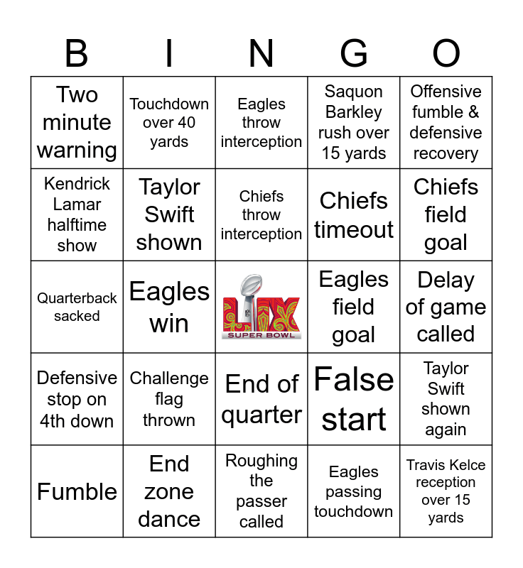 This bingo card has a free space and 34 words: Chiefs passing touchdown, Eagles passing touchdown, Chiefs rushing touchdown, Eagles rushing touchdown, Defensive stop on 4th down, Taylor Swift shown, Offensive fumble & defensive recovery, Fumble, Touchdown over 40 yards, Tush push, Chiefs throw interception, Eagles throw interception, Missed field goal, Game tied up after 0-0, Eagles field goal, Chiefs field goal, End zone dance, Quarterback sacked, Challenge flag thrown, False start, End of quarter, Any team scores 20+ points, Two minute warning, Delay of game called, Roughing the passer called, Travis Kelce reception over 15 yards, Saquon Barkley rush over 15 yards, Eagles timeout, Chiefs timeout, Kendrick Lamar halftime show, Chiefs win, Eagles win, Taylor Swift shown again and Interception.