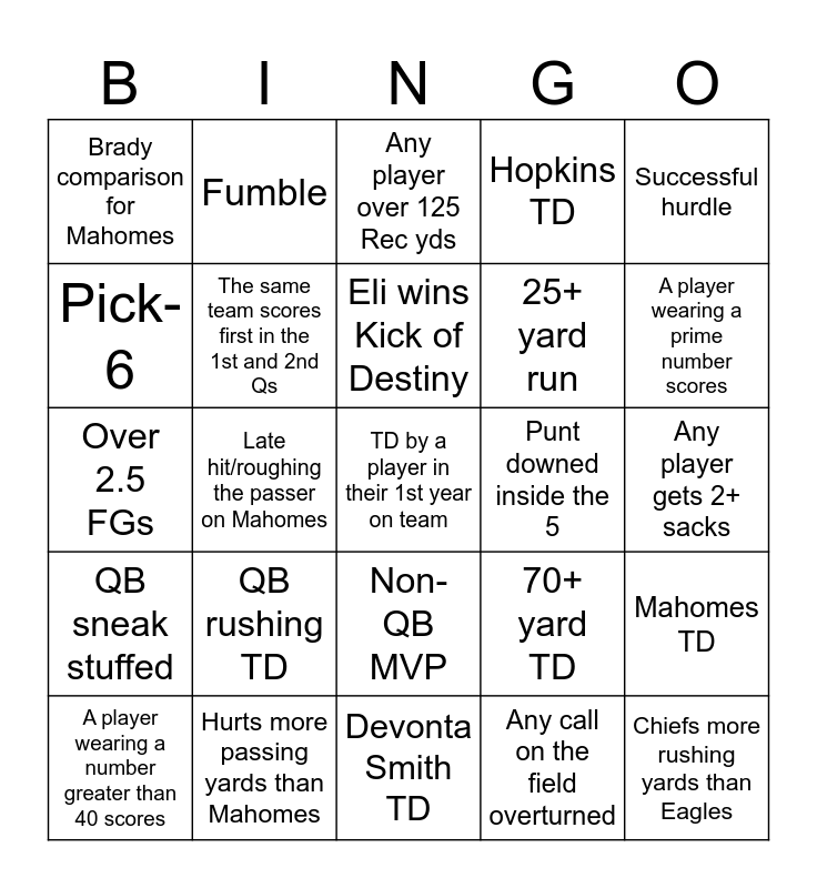 This bingo card has 63 words: Safety, Kick/Punt return TD, Saquon over 150 Yards, Mahomes TD, Kelce TD, AJ Brown TD, Fumble, Failed 2 pt conversion, Eli wins Kick of Destiny, Peyton wins Kick of Destiny, Non-QB MVP, Non-QB completes a pass, Any player gets 2+ sacks, Successful hurdle, 50+ yard FG made, Pick-6, Late hit/roughing the passer on Mahomes, Brady comparison for Mahomes, 40+ yard pass, 25+ yard run, QB rushing TD, QB sneak stuffed, Hopkins TD, Wide receiver with 15+ yd rush, Non-Kelce TE TD, Over 350 total yds of offense 1st Half, 4th Q Lead change, Over 48.5 total points, Big 10 player scores, SEC player scores, Big 12 Player Scores, Coin Flip is Heads, Coin Flip is Tails, Successful Stiff arm to Break a tackle, A player wearing a prime number scores, A player wearing a number greater than 40 scores, Any offensive lineman gets an anecdote, Any call on the field overturned, Yellow gatorade dumped on winning coach, The same team scores first in the 1st and 2nd Qs, Over 2.5 FGs, Punt downed inside the 5, A hit that probably wasn't a penalty 20 years ago draws a flag, Under 18.5 1st half points, TD by a player in their 1st year on team, Hurts more passing yards than Mahomes, Chiefs more rushing yards than Eagles, 70+ yard TD, Missed XP, Kelce over 6.5 Receptions, Hollywood Brown TD, Devonta Smith TD, Kareem Hunt TD, 10+ minute drive, Under 90 second TD drive, Any player over 125 Rec yds, Either QB over 300 passing yds, Over 2.5 total Int, Over 1.5 1st half Turnovers, Blocked kick or punt, Hard count draws an offside, Soft pass interference and Players get into it on the sideline.