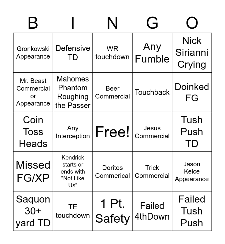 This bingo card has a free space and 39 words: Taylor Swift Appearance, Sam Rages, Trump Appearance, Mahomes Phantom Roughing the Passer, Saquon 30+ yard TD, Doritos Commerical, Beer Commercial, Taco Bell Commercial, Nick Sirianni Crying, Missed FG/XP, Any Interception, Any Fumble, Failed Tush Push, Tush Push TD, Jesus Commercial, Kendrick starts or ends with "Not Like Us", Mahomes Glazing, Gronkowski Appearance, Brittany/Jackson Mahomes Appearance, Trick Commercial, Mr. Beast Commercial or Appearance, 1 Pt. Safety, Touchback, Doinked FG, Stupid Celebration Dance, Car Commercial, Fast Food Commercial, 30+ yard DPI, Mahomes complains, Defensive TD, Special Teams TD, Gambling Commercial, WR touchdown, TE touchdown, Failed 4thDown, RB touchdown, Jason Kelce Appearance, Coin Toss Heads and Coin Toss Tails.