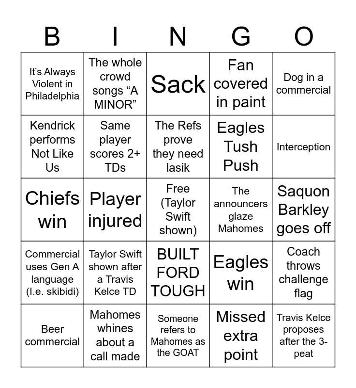 This bingo card has a free space and 24 words: Taylor Swift shown after a Travis Kelce TD, Mahomes whines about a call made, The Refs prove they need lasik, Beer commercial, Dog in a commercial, It’s Always Violent in Philadelphia, Kendrick performs Not Like Us, The whole crowd songs “A MINOR”, The announcers glaze Mahomes, BUILT FORD TOUGH, Eagles Tush Push, Chiefs win, Eagles win, Coach throws challenge flag, Same player scores 2+ TDs, Missed extra point, Saquon Barkley goes off, Sack, Interception, Player injured, Travis Kelce proposes after the 3-peat, Commercial uses Gen A language (I.e. skibidi), Fan covered in paint and Someone refers to Mahomes as the GOAT.