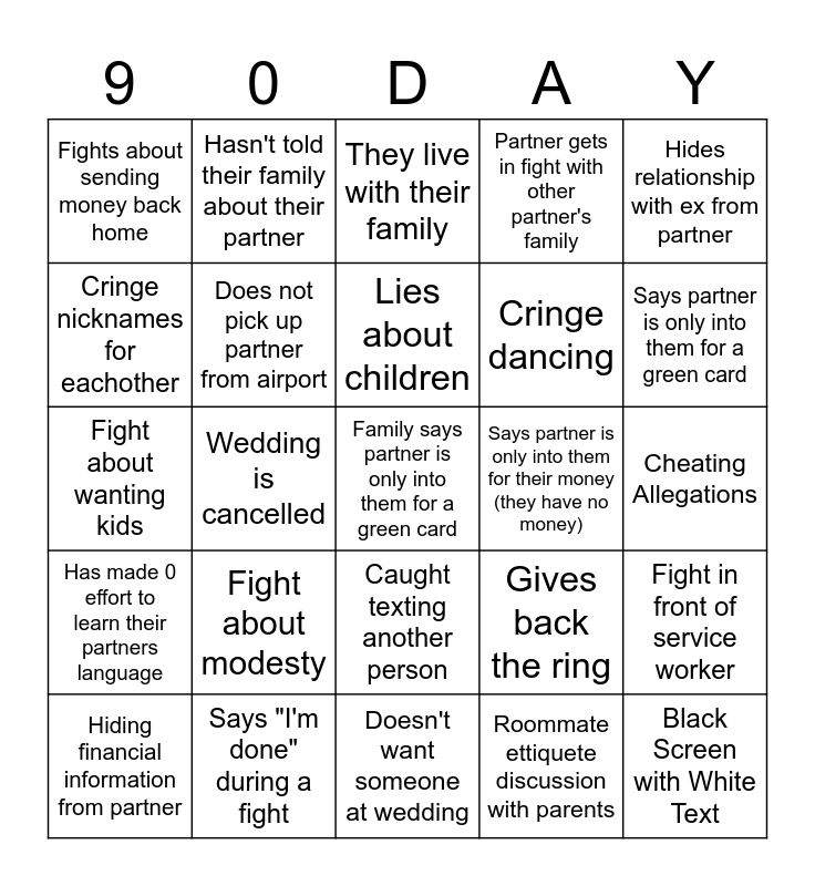 This bingo card has 33 words: Black Screen with White Text, Serial importer, Wedding is cancelled, Takes partner to vacation to better city before moving to middle of nowhere, Has made 0 effort to learn their partners language, Does not pick up partner from airport, Hides relationship with ex from partner, Hiding financial information from partner, Hasn't told their family about their partner, Lies about age, Lies about children, They live with their family, Camera crew in the room way too long, "I haven't heard from my partner in x days", Says partner is only into them for their money (they have no money), Says partner is only into them for a green card, Says "I'm done" during a fight, Fight about wanting kids, Fight about modesty, Gives back the ring, Caught texting another person, Met once or less in person, Fights about sending money back home, Cheating Allegations, Doesn't want someone at wedding, Family says partner is only into them for a green card, Partner gets in fight with other partner's family, Cringe dancing, Cringe nicknames for eachother, Fight in front of service worker, Sink shower in airport, Roommate ettiquete discussion with parents and Fight in front of friends/family.