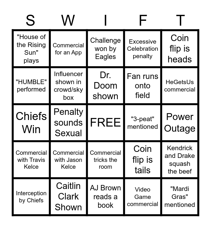 This bingo card has a free space and 39 words: Taylor Swift Celebrates on Camera, Kendrick references Trump, Challenge won by Chiefs, Influencer shown in crowd/sky box, Interception by Chiefs, Commercial tricks the room, Dr. Doom shown, Mahomes Sacked, Coin flip is heads, Commercial with Travis Kelce, Penalty sounds Sexual, Excessive Celebration penalty, "Mardi Gras" mentioned, Power Outage, "3-peat" mentioned, Commercial with Jason Kelce, Drake Mentioned, "House of the Rising Sun" plays, Celeb-endorsed Crypto Commercial, Coin flip is tails, "HUMBLE" performed, AJ Brown reads a book, Fan runs onto field, HeGetsUs commercial, Coin Flip is Tails, Penalty Against Eagles, "All the Stars" Performed, Jalen Hurts rushing TD, Mahomes rushing TD, Commercial for an App, Holding Penalty, Two Consecutive 1st Downs, Challenge won by Eagles, Caitlin Clark Shown, Video Game commercial, Dre joins Kendrick, Kendrick and Drake squash the beef, Chiefs Win and Eagles Win.