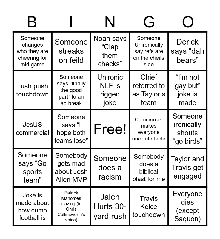 This bingo card has a free space and 34 words: Saquon 30+ yard TD, Someone makes Patrick Mahomes Kermit joke, Perron makes fun of bills mafia, Patrick Mahomes interception gets called back by BS call, Someone ironically shouts “go birds”, Tush push touchdown, Someone says “finally the good part” to an ad break, Jalen Hurts 30-yard rush, Chief referred to as Taylor’s team, Everyone dies (except Saquon), JesUS commercial, Someone streaks on feild, Travis Kelce touchdown, Derek gets hit the nuts, Someone says “Go sports team”, Someone says “I hope both teams lose”, Someone does a racism, Commercial makes everyone uncomfortable, Taylor and Travis get engaged, Joke is made about how dumb football is, Patrick Mahomes glazing (in Chris Collinsworth's voice), Travis yells at Andy Reid, Someone Unironically say refs are on the cheifs side, “I’m not gay but” joke is made, Patrick Mahomes 20 yard rush, Somebody gets mad about Josh Allen MVP, Noah says “Clap them checks”, Someone (most likely me) makes a joke they shouldn’t have, Derick says “dah bears”, Someone changes who they are cheering for mid game, Fight brakes out, Unironic NLF is rigged joke, Somebody does a biblical blast for me and Saquon performs in human feet.