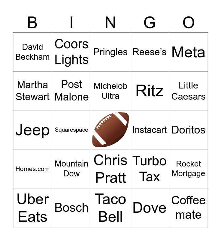 This bingo card has a free space and 29 words: Uber Eats, Budweiser, Squarespace, Nerds, David Beckham, Pringles, Post Malone, Mountain Dew, Instacart, Bosch, Doritos, Coffee mate, Taco Bell, Dove, Little Caesars, Bud Light, Chris Pratt, Homes.com, Meta, Jeep, Turbo Tax, Drew Barrymore, Ritz, Martha Stewart, Reese’s, Coors Lights, Rocket Mortgage, Michelob Ultra and Channing Tatum.
