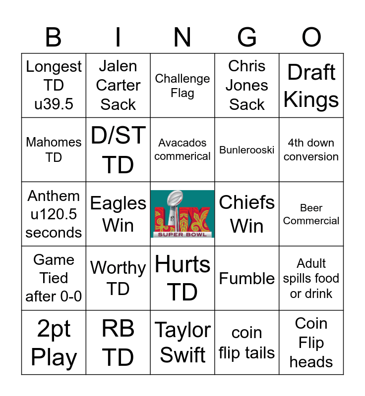 This bingo card has a free space and 29 words: 2pt Play, Kelce Commerical, Eagles Win, Trick Play, Longest TD u39.5, Challenge Flag, D/ST TD, Worthy TD, Chiefs Win, RB TD, Beer Commercial, Coin Flip heads, Taylor Swift, coin flip tails, 4th down conversion, Int, Hurts TD, Game Tied after 0-0, Draft Kings, Anthem u120.5 seconds, Fumble, u48.5, Bunlerooski, Mahomes TD, Chris Jones Sack, Jalen Carter Sack, Adult spills food or drink, Avacados commerical and Non-QB MVP.