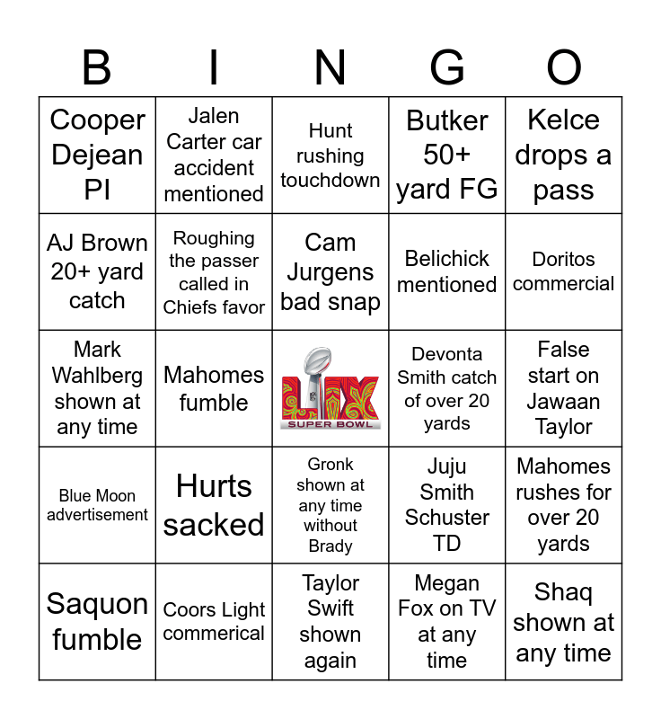 This bingo card has a free space and 79 words: Mahomes passing touchdown, Hurts passing touchdown, Hunt rushing touchdown, Gainwell rushing touchdown, Tush push stopped, Taylor Swift hugs Donna Kelce, Sydney Sweeney commercial, Chris Jones Fumble recovery, Any play over 40 yards, Successful Tush Push, Mahomes throws interception, Saquon hurdles a dude, Butker 50+ yard FG, Cooper Dejean PI, Eliott botches a kick, AJ Brown 20+ yard catch, Any griddy in endzone, Hurts sacked, Budweiser commercial, False start on Jawaan Taylor, ASPCA commercial, Kelce drops a pass, Mark Wahlberg shown at any time, Cam Jurgens bad snap, Roughing the passer called in Chiefs favor, Kelce reception over 20 yards NO T-SWIFT showing, Saquon Barkley rush over 15 yards, Blankenship interception, Hopkins TD, Sydney Sweeney Mayo commercial, Doritos commercial, Bud Light commerical, Taylor Swift shown again, Hurts strip sacked, Saquon fumble, Devonta Smith catch of over 20 yards, AJ Brown TD, Goedert TD, Kelce TD, Shaq shown at any time, Dwayne "The Rock" Johnson commerical, Skittles Commercial, Doritos Commercial, Andy Reid does something really fat, Chris Jones sack, Jalen Carter car accident mentioned, Zach Baun huge hit across the middle, Siriani cries during National Anthem, Mahomes rushing TD, Jalen Hurts 2+ Passing TD's, Mahomes rushes for over 20 yards, Mahomes fumble, Juju Smith Schuster TD, Saquon 2+ TDs, Trent McDuffie Pick, Holding on Trey Smith, Holding on Landon Dickerson, Pick Justin Reid, Leo Chenal sack, Gronk shown at any time without Brady, Belichick mentioned, Karlaftis sack, CJ Gardner-Johnson PI called, Mekhi Becton crippling penalty to an Eagles drive, Jordan Davis sack, Nolan Smith strip sack, Quinyon Mitchell PBU, Darius Slay burned on a deep ball, Daris Slay pick, Blue Moon advertisement, Coors Light commerical, Michelob Ultra commerical, Trump on TV at any time, Army recruiting AD, Nick Saban mentioned, Megan Fox on TV at any time, Xavier Worthy 30+ yard play, Xavier Worthy TD and Hollywood Brown TD.